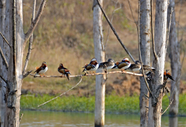 鸟鸣为证,山水为媒。鸳鸯湖因成双栖息的野生鸳鸯得名,碧水揽双影,青苇曳私语。春泛轻舟破翠镜,秋燃红蓼映霞天,湖畔木栈蜿蜒成诗行。传说恋人绕湖三圈,白首不离分。